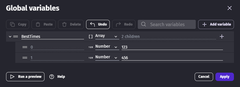 Arrays can be created in the Variables Editor, using events or by using an extension like JSON resource loader.