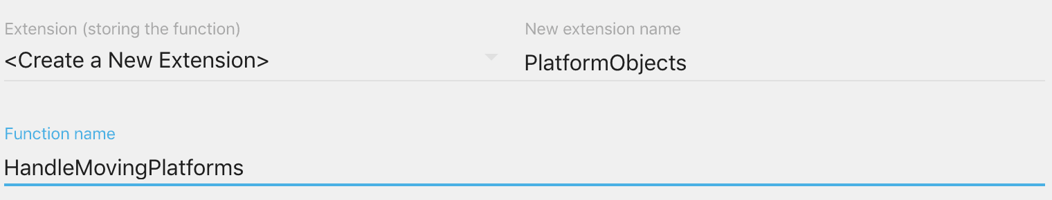 The first field ask you for the extension where the function must be stored. Remember that functions are grouped into extensions. If you intend to create multiple functions related to a same feature (for example, functions to deal with the inventory, a battle system or to help you manage the enemies in your game), it's better to group them in a same extension with a name related to the feature.