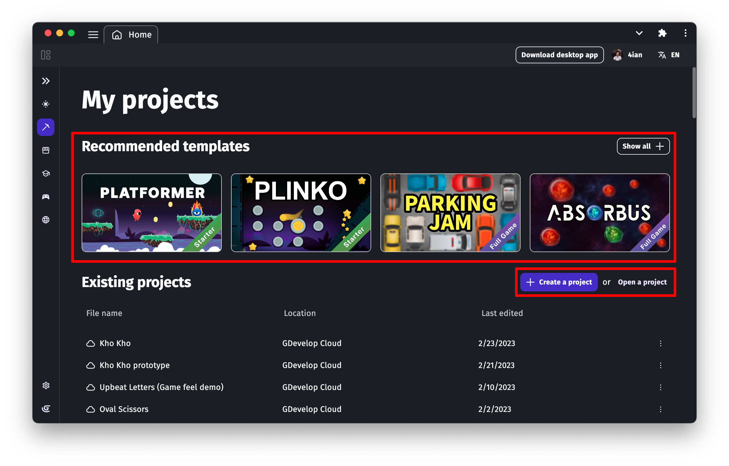 When you launch GDevelop, you can choose a game template that can be customized in a few minutes (which is great for getting a feel for game creation), open a game template in the editor, or start from scratch.