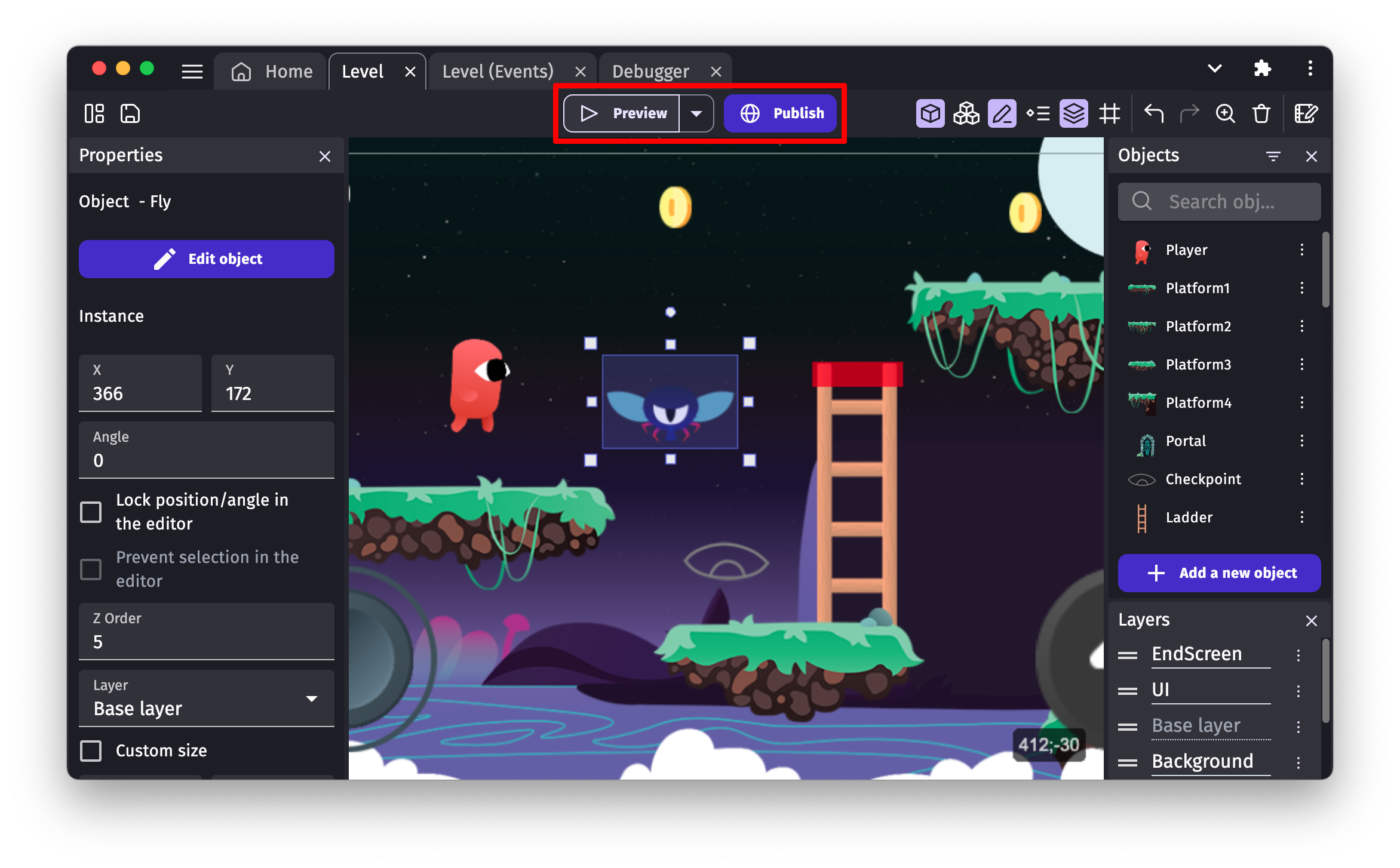 A Preview button is available in the toolbar. This button launches a preview of your game in a new window.