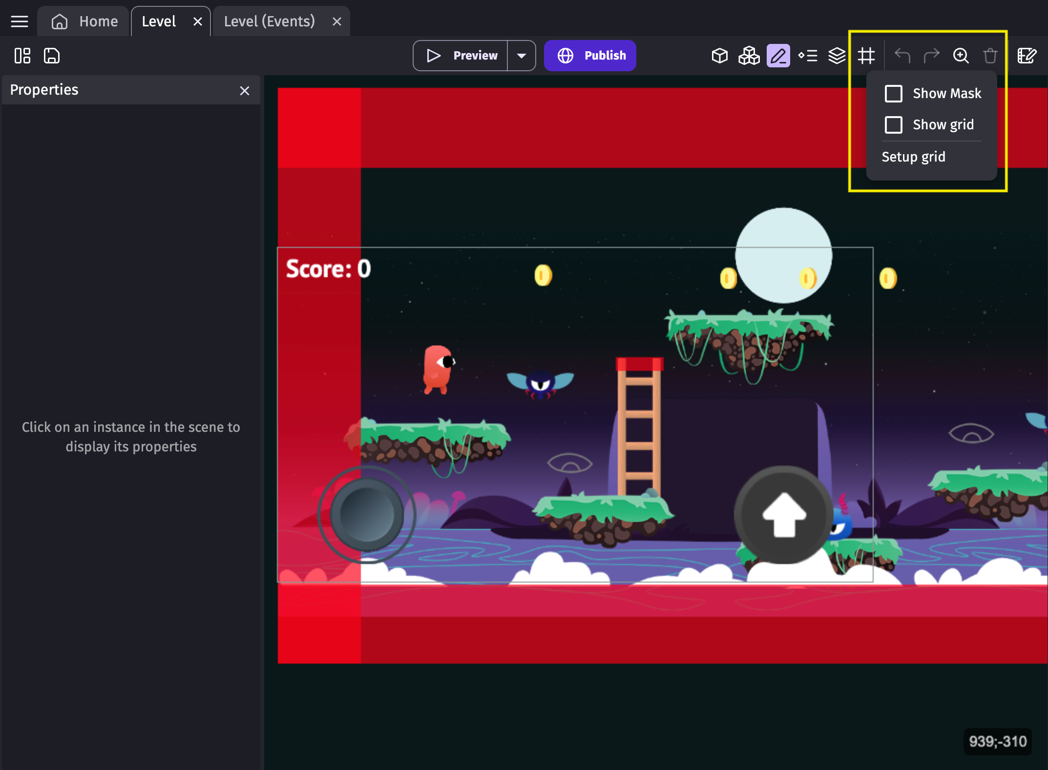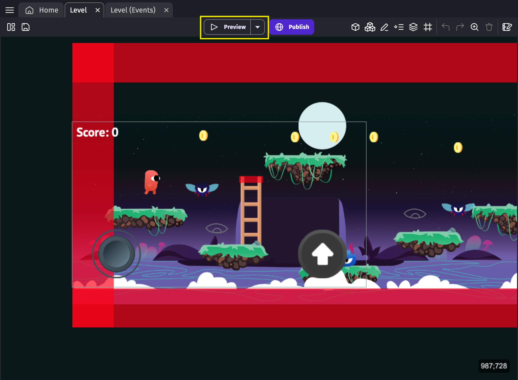 By clicking on the "Preview" button, you can launch a preview of your game.