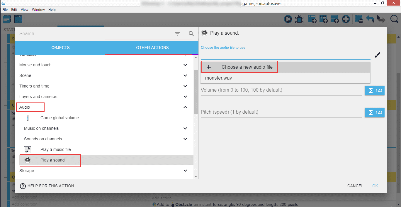 From within "Other actions" we're going to add a different sound when that happens. "Audio", "Play a sound", "Choose a new audio file" to open the file explorer window.
