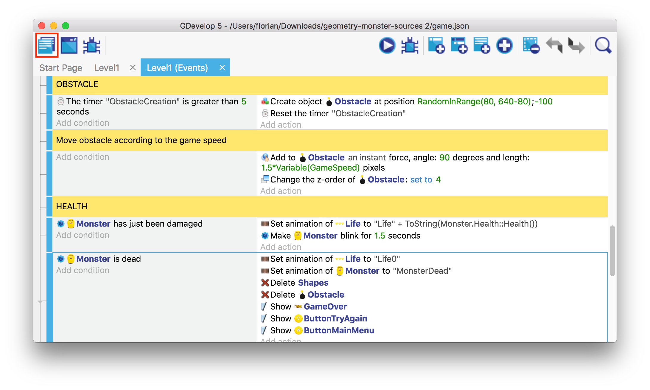Since we now know how to switch between scenes, let's do this for the Try Again button we've created earlier on, but haven't implemented the actual action yet. Click on the "Level1 (Events)" tab, and "Add a condition".