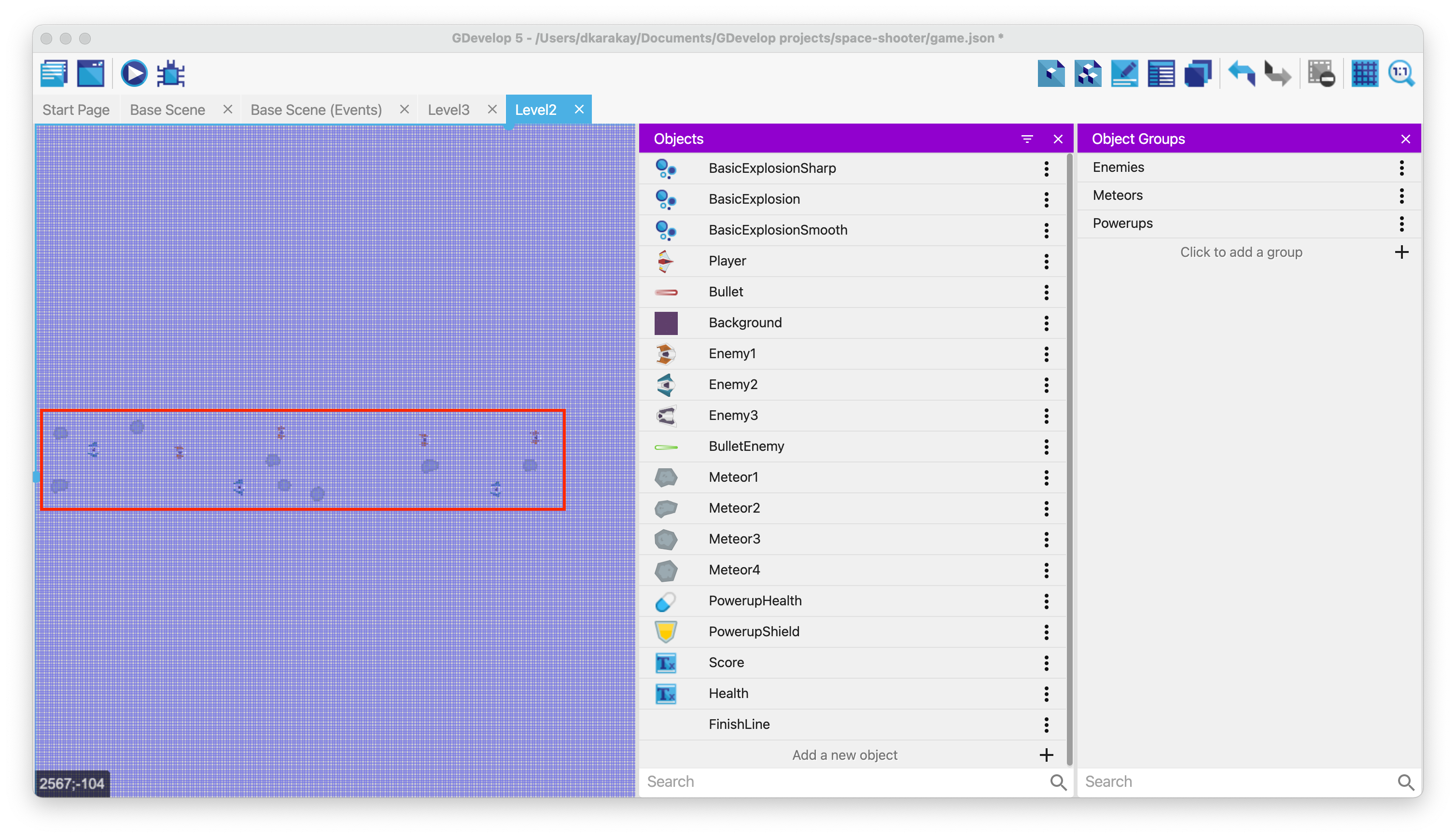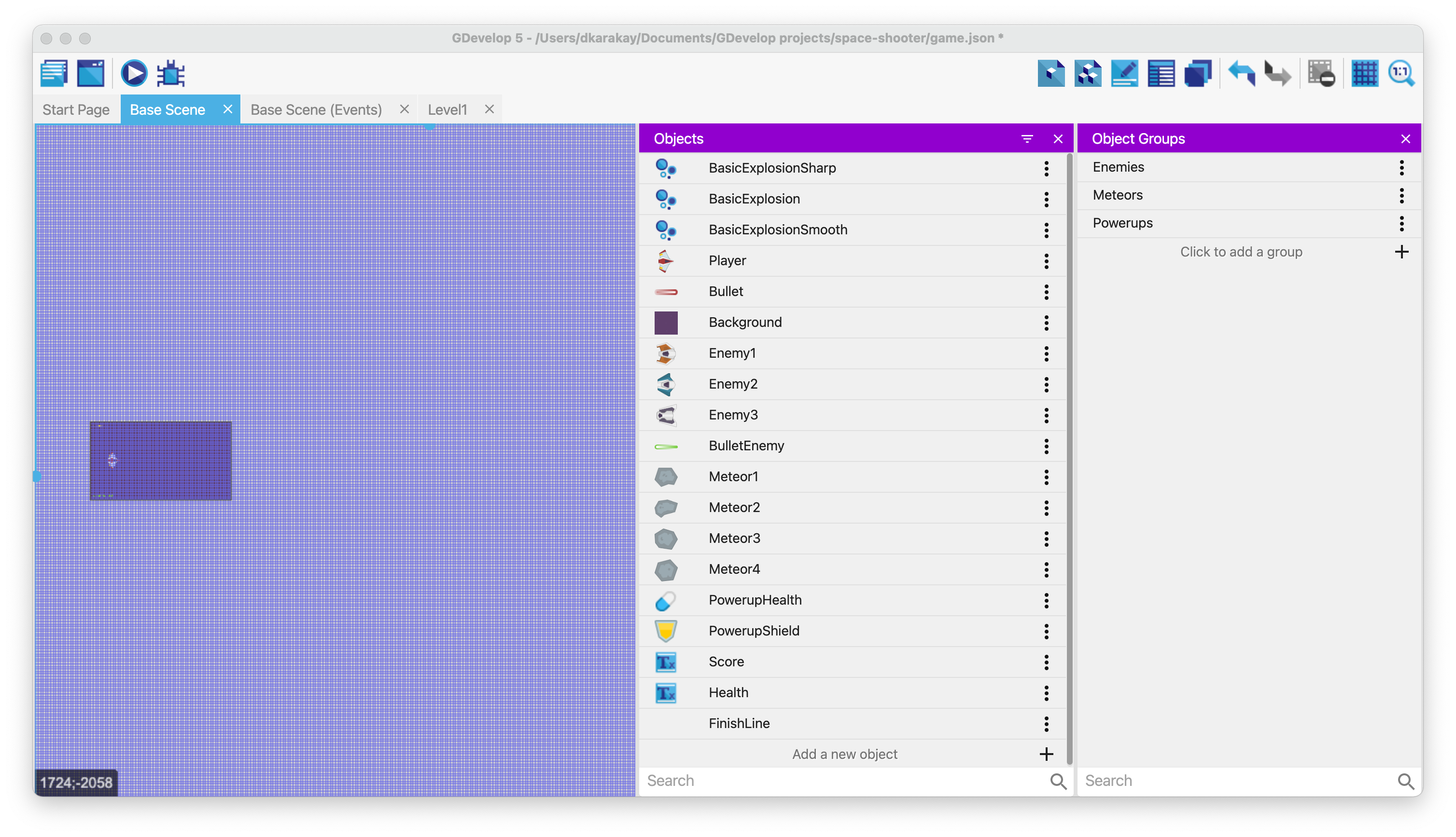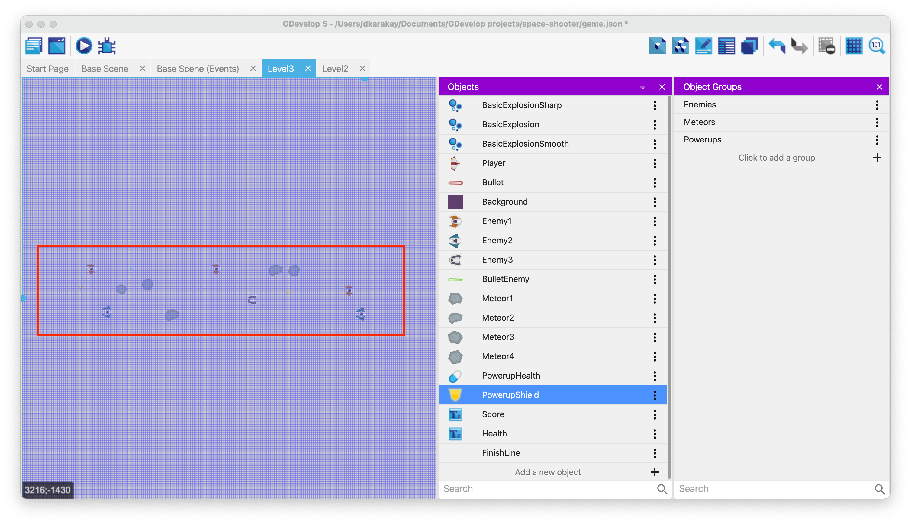 Now, we should go back to the Base Scene and delete all enemies, powerups, meteors, and the finish line. We will add those objects and set up our levels in the external layouts.