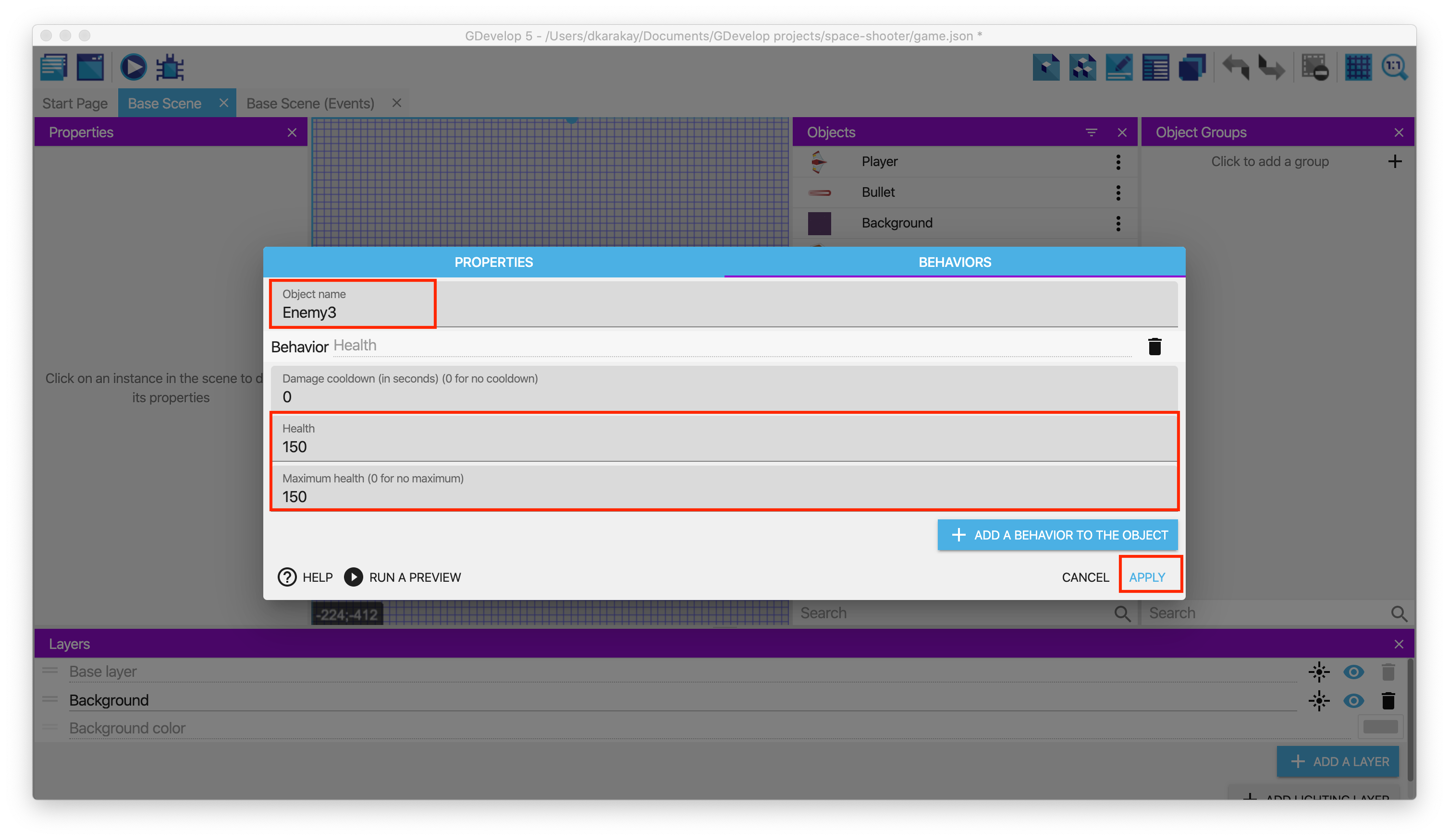 Then, open the behavior page of Enemy1 and leave it as is: Health: 100, Maximum health: 100